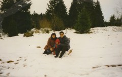 Llegó el invierno otra vez, y con él: la nieve. Mi niña tenía un año tres meses, mi mamá nos visitaba. Iríamos a la montaña. Entonces recordé haber visto un pequeño trineo en el sótano. Lo subí y lo llevamos. Empezamos jalando a mi niña, y estaba encantada. Todo era nuevo para nosotros. Mamá era tan alegre y juguetona, que se subió ella en el trineo y mi esposo la jalaba en una pequeña montañita. Fuimos tomando turnos entonces. ¡Es una de las cosas mas divertidas que hemos hecho! Y fué uno de los días mas especiales de mi vida. Vi a mi mamá jugar como niña en la nieve, tirarse acostada sobre ella y hacer muñecos. Mamá murió unos años después por lo que atesoro esos hermosos recuerdos.